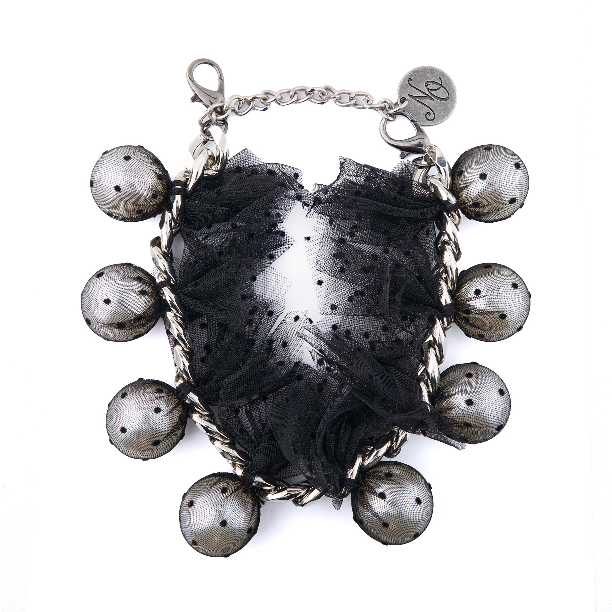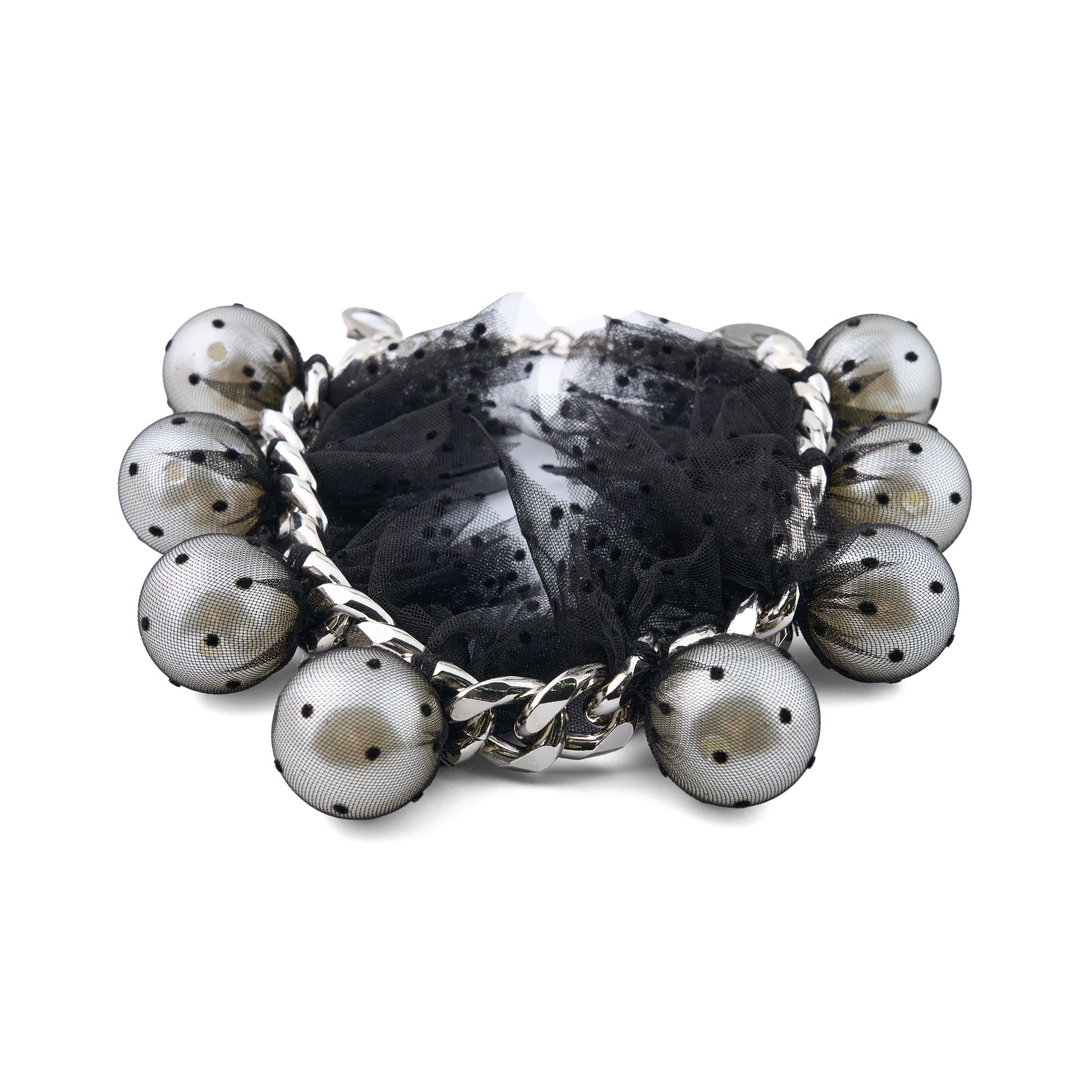 PEARL NECKLACE WITH BLACK POLKA-DOT TULLE AND METAL CHAIN / BLACK